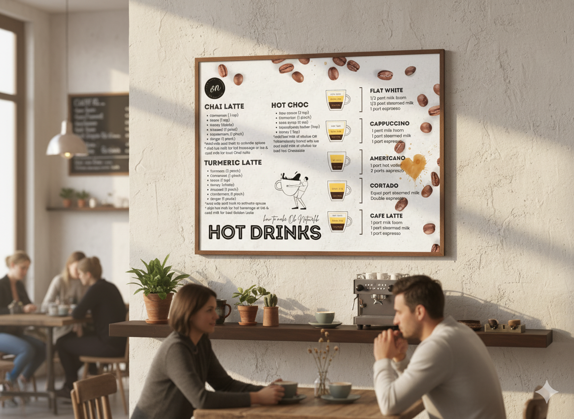 Oh Natuurlik Hot Drinks Menu Chart designed by Charlene Lutge